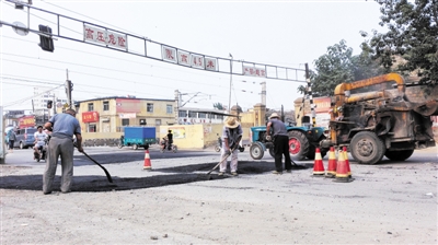 近日,几名工人对市中区青檀北路坑洼严重的路面进行修补。路过的市民表示,本次修补只能暂时缓解该路段路面的破损问题,若要彻底解决此处的“伤情”,还需要对该路段进行大修。 (记者 王龙飞 摄)