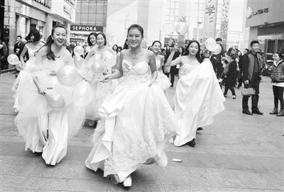 近日,市中区吉品街街头热闹非凡,由某商家策划的“奔跑吧新娘”促销活动,吸引了数十名新娘在街头狂奔,引来不少市民关注。 (记者 邵士营 摄)