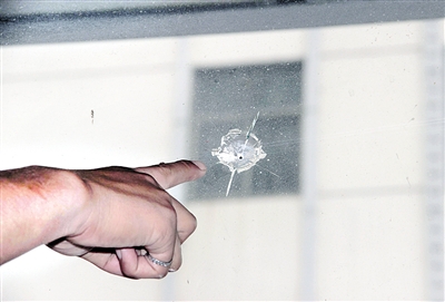 晚报讯 (特约记者 郭潇繁 摄影报道)6月23日上午,滕州市府前中路步行街附近一家商铺的店员正准备开门营业时,突然发现玻璃橱窗上面出现一个圆形的“弹孔”。