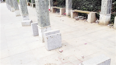 晚报讯 (记者 李帅 摄影报道)近日,家住峄城区的许先生拨打本报热线反映,称峄城区匡衡小学校门南侧不远处有一处休闲长廊,长廊里的休闲座椅破损严重,很多座椅的椅面消失不见,石制座椅腿也是胡乱地歪倒在长廊里,再加上长廊里满地垃圾,让人无法在长廊里休息。“我也没想到这个长廊会如此脏乱和破败,最近接送学生早去了一会儿,就在学校附近逛逛,结果来到这长廊里,就看到这幅情景。”许先生说道。