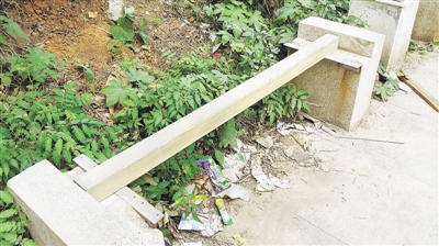 记者随后来到该学校南侧的长廊,映入眼帘的都是残缺不全的座椅,二十多米的长廊两侧竟没有一个完整的座椅。有的只剩下了两块作支撑的石块,有的甚至连石块都倒在了地上。好一些的就是座椅椅面上少了一根木条,人还勉强可以坐上去。根据残存的座椅,记者可以想象,如果座椅完整,肯定非常古朴大方。“如果只是座椅毁坏,那么这个长廊或许还会有人在里面休闲,但是现在不仅座椅毁坏严重,而且长廊里外全是垃圾,这就很难让人驻足。”市民褚先生向记者说道。