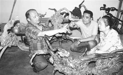 “不要小看一件小小的根雕,每个工序都马虎不得。”高铁友进一步介绍说,审根时要集中、提炼、组合,反复比较和揣摩,找出最佳观赏面,即最典型的形象;雕琢以自然美为主,人工美为辅,凡可雕可不雕者则不雕,凡根木材料有缺憾不雕不成器,则可借雕琢的方法来弥补;要领以材料上的筋脉、纹理、皱褶、崎岖、枝杈凹凸、孔洞、瘤块、疙瘩、缠绕等进行赋意构思;根雕作品的题名也很讲究:根雕题名要巧,巧得贴切、巧得含蓄,要做到引人入胜,使人遐想,使观者听到弦外之音,悟到画外之意……没想到一件根雕作品竟有那么多学问。