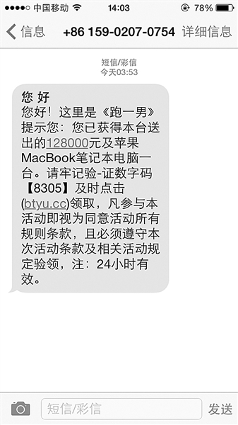 5日上午,家住市中区立新小区的刘女士收到一条来自《跑男》节目组的中奖短信,信息称“您已获得本台送出的价值128000元以及苹果笔记本电脑一台。牢记验证码登录‘btyu.cc’网站领取。”