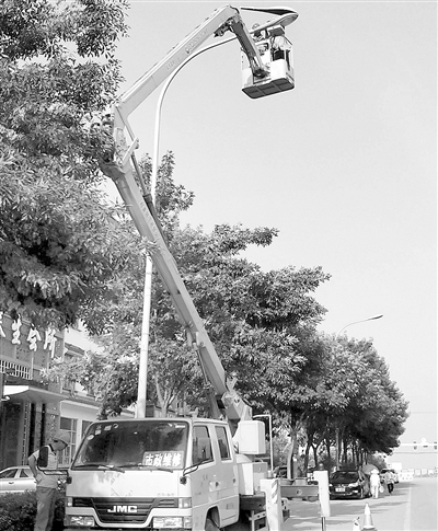 近日,为了确保市民夜晚安全出行,市中区市政部门工作人员不顾高温酷暑,在各路段巡查更换问题路灯。