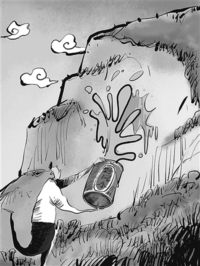 重庆綦江区赶水镇一处900米高的崖壁,被人为用绿油漆刷了一层,面积近2000平方米。找来油漆工的,是当地一位杨姓村民。他说之前白色的崖壁影响他家的风水,所以把山崖涂了。