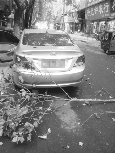 下午5点40分,记者赶到事发路段,路南一商铺的店主告诉记者,被砸中的车辆刚刚驶离现场,掉落的树枝也已被人挪至别处。店主告诉记者,事发时大约是当天下午4点,当时从路北的一行道树上掉下一段长约1.8米,直径约有2厘米的树枝,将停在路边的一灰白色轿车后挡风玻璃砸裂,形成一块长约10厘米的洞口,外侧也可见一圈圈破碎的裂纹。这位店主说,这边的法桐已有四五十年的树龄了,平均树高均在20米左右。由于年头已久,部分树枝因大风或干枯等原因,便会掉落下来。“几个月前就发生过类似的事情,当时是一根直径约5厘米的树枝,直接掉落在一行人的面前,差点砸到他的脑袋。”店主接着说道:“虽然掉落的树枝看似很细,可掉落加速后也会产生很大的力量,还是希望有关部门能够对该路段行道树进行一次彻底的修剪,以免造成严重的后果。”