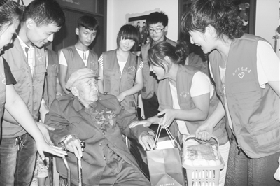 日前,滕州市志愿者协会的志愿者们带着鸡蛋、香蕉等物品,来到姜屯镇大彦南村,看望了94岁高龄的抗日老战士王庆田。王庆田老人先后参加过大小近百次战斗,至今身体里还留有一枚子弹头,并荣获多项嘉奖。 (特约记者 侯志龙 摄)