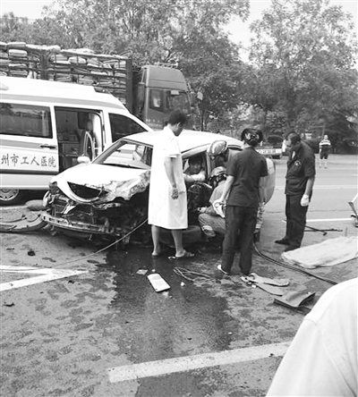 轿车车头处面目全非,车内方向盘被撞得飞出车外,车辆几乎报废,地上散落着轿车车头处因撞击而产生的大量碎片。轿车驾驶员腿部被卡,被困车中,消防官兵和工人医院的医务人员迅速赶到现场,在消防官兵切割车内部件救人的过程中,医务人员给伤者打上了点滴。
