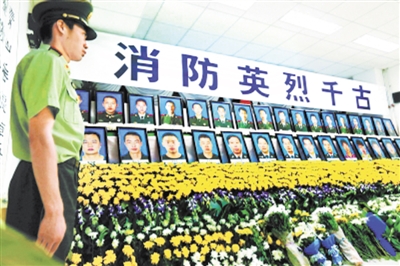 昨日,天津港“8·12”特别重大火灾爆炸事故悼念活动在天津举行。天津市公安消防开发支队官兵在灵堂内悼念遇难战友。截至当日上午9时,遇难者114人,确认身份83人。 (新华社)