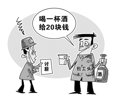 17日,郑州市铭功路二道街一丸子店内,一农民工与包工头喝酒讨要工钱,包工头称“喝一杯20块”,农民工将一杯酒灌下后昏迷在街头。该男子叫张百春,在郑州打零工,劝其喝酒的包工头欠其四五万元工钱,张多次讨要未果。(8月18日《郑州晚报》)