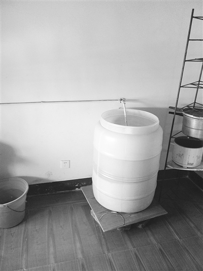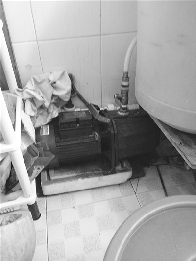 居民无法正常用水,大部分居民都在家中安装了水泵。记者来到六楼的一个住户家中,打开了水龙头,这户居民指了指墙角告诉记者:“有水全靠它,关上它就没有水了。”记者看到,在靠近水龙头的墙角有一个小型的水泵,水泵连接着自来水管线。记者在居民家中的厨房和阳台等地看到数个大大小小的水桶,里面全都装满了水。随后,主人又将记者带到他家的阁楼上,里面有一个很大的水桶,里面装满了水,水上面漂着一层水垢一样的东西。“这里面的水是用水泵抽上来的,洗衣做饭全靠它。抽上来的水储存在水桶里,常年这样也不卫生。”该居民说。