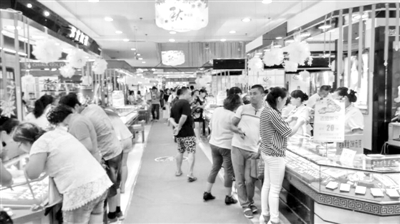 近日,记者在薛城区永兴路上的一家大型商场内看到,不少品牌推出打折活动,黄金首饰259元/克,引来不少市民前来购买。