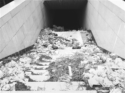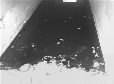 站在地下通道入口处难以拍到清晰的画面,记者强忍着恶臭,走到通道下方观察了一会儿,发现地下通道内浑浊的污水底部已经沉积了很多灰黑色物质,台阶上被杂草和垃圾覆盖的地方隐藏着一些动物和人的粪便,正因如此,才致使附近的空气中飘荡着难闻的气味。