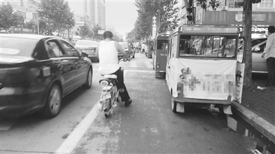 记者了解到,此处路口自西向东行驶有四个车道,分别是两个左转向车道,一个直行车道和一个非机动车道,而载客三轮占据了非机动车道,非机动车道上的车辆被阻挡,不得不“借用”机动车道,导致道路险象环生。“过不去总不能一直停在那里,等机动车道上车少的时候从机动车道过去。”一位骑电动三轮车的市民无奈地说。