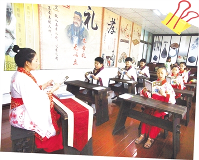 8月28日,学生们正在老师的带领下诵读古文。滕州市图书馆暑假期间举办了国学文化讲堂,老师为学生们讲解了《弟子规》、《三字经》和《千字文》等。