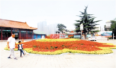 9月23日,市民在滕州市荆河公园门前观看巨型花坛。据了解,为迎接中秋、国庆两节的到来,滕州市组织园林工人在荆河公园、善国路、龙泉路、学院路等处种植花草和制作花坛,营造浓厚的节日氛围。(特约记者 侯志龙 摄)