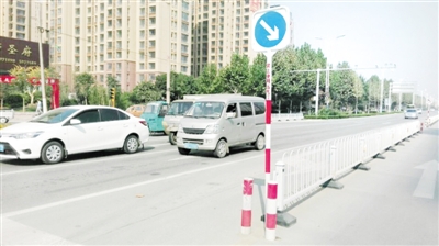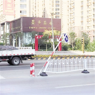 近日,滕州市府前东路与龙泉路交会处以北,路中间护栏处竖起的交通指示杆向一旁倾斜,一个防撞墩被撞瘪,而连接指示杆的护栏也被撞变形。当日中午,被撞的交通指示杆被市政工程处的工作人员扶正,护栏和防撞墩也已经恢复原样。 (记者 姚付林 摄)