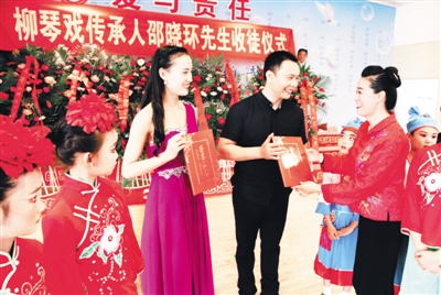 10月23日上午,枣庄市非物质文化遗产(柳琴戏)传承教育基地揭牌仪式暨柳琴戏传承人邵小环收徒仪式在市中区文化路小学举行。邵小环是柳琴戏的省级代表性传承人,多年来在全市中小学培养了学员400余名。 (记者 张琛 孙明春 摄)