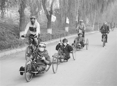 11月3日上午,身患高位截瘫(脊髓损伤)的残障人士王丰等3人驾着手摇自行车与几位骑行爱好者从市区出发,奔赴江苏宿迁。王丰是“手摇中国”的创办人和发起人之一,他希望通过活动让更多人了解脊髓损伤,了解脊髓损伤人群和他们的故事。