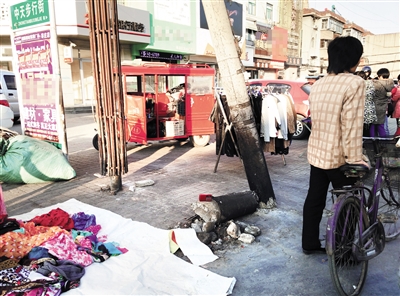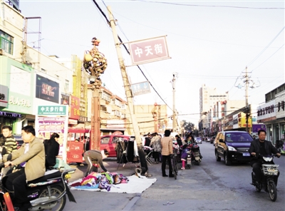 4日,在市中区兴安街与中天步行街交会处东侧,一个挂有“中天街”指示牌的电线杆底部断裂,斜靠在上方的电线上,存在安全隐患。 (记者 刘一单 摄)