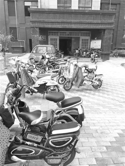 记者走访时发现,很多住户的家门口也停放着电动车。对于这个现象,正推着电动车等电梯的李女士也很无奈,“我家住在17层,小区没有公共停车处,楼下摆满了车辆,没办法,我也不想把电梯变成搬运电动车的工具,可是没电了就得运上去充电啊。”