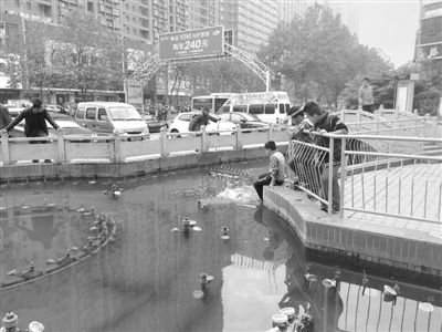 当天中午记者来到步行街南口的小池塘,恰好见到几个孩子围在池塘周围,其中一个正将脚往水里伸,过了一会儿,他干脆跳下水去,用手捞鱼。当天温度较低,但孩子们全然不顾,不少市民也在旁边劝他们别下水,但他们对旁人的劝告置之不理。
