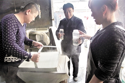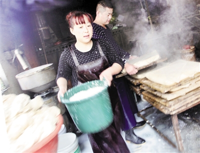 每天早上5点就起床泡豆子、洗笼布、刷水桶等,草草地吃点早饭就开始干活,中午饭也是凑合着吃几口,一直忙到下午4点多,到了晚饭才能坐下来好好吃一顿,夜里3点,他们就得起床装车到利民市场去批发。日复一日,小两口不管天气阴晴,风雨无阻,唯恐耽误了客户的生意,一年到头,他们连个商店都没空逛。