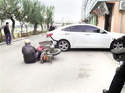 当日下午,在沿河路上,一辆白色轿车横着停在路中间,尾部凹陷,旁边地上坐着一位戴着头盔的男子,身边的摩托车“躺”在地上,车前轮变形。据介绍,白色轿车倒车行至路中间的位置,恰巧一辆摩托车驶来,该驾驶员刹车不及撞了上去。因戴着头盔,摩托车驾驶员未伤及头部。“有人打了120,救护车过会儿就能到。”目击者告诉记者。