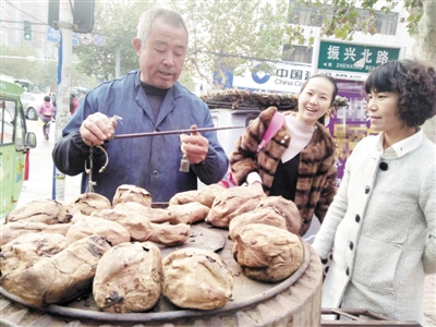冬天到了,大街小巷又飘起了烤红薯的浓浓香味。山亭区62岁的张成义,骑着三轮车载着大烤桶来到城里,把热腾腾的烤红薯送到市民手中。 (记者 孙慧英 摄)