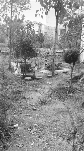 走近这段绿化带,记者看到其中树与树之间连接着晾晒绳,纵横交错毫无规律可言。北边不远处,一只鸡正在绿化带中来回走着,不时地寻找吃的东西。向前走去,就是赵先生所反映的养鸡养鸭的地方了。在绿化带中有一个用网围成的鸭圈,西侧是一个小水池,东侧有一个笼子,几只鸭子正在水池边嘎嘎地叫着。在鸭圈的周围还有几只鸡。