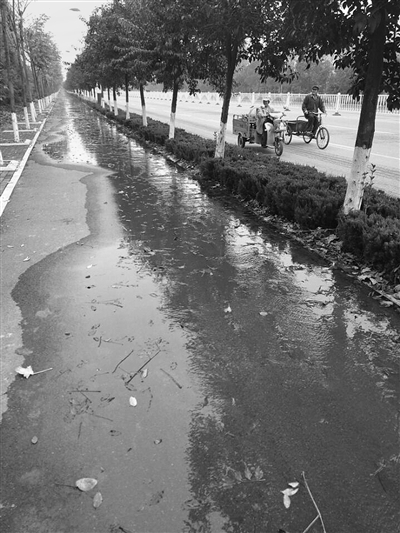 附近一位正在打扫卫生的环卫工告诉记者,“这儿漏水已经快一年的时间了,今天这里漏,被修好后,明天那里又开始漏,路边那些没有掩埋的坑就是维修管道时留下的。”随后记者看到,非机动车道的旁边确实有数个被挖出的坑,坑里面也全是污水,有七八个之多。