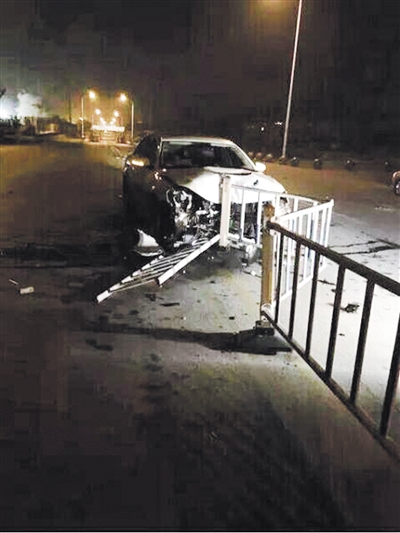 近日,在滕州市青啤大道大同天下小区附近发生一起交通事故,一辆白色大众汽车撞上道路隔离护栏。目击市民表示,事发时是凌晨1点左右,肇事车辆车头受损严重,隔离护栏被撞变形。