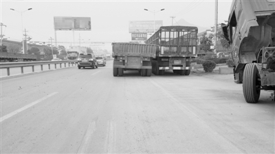 近日,在峄城区东外环路段,路边并排停着两辆大卡车正在检修。原本三车道的路被占去了一大半,无论是非机动车还是机动车经过这里都非常危险。 (记者 李帅 摄)