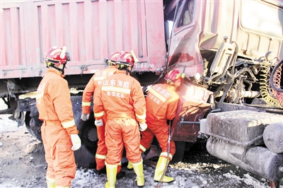晚报讯 (记者 焦兴田 通讯员 郭昊 摄影报道)11月26日15时44分,滕州消防大队接到报警称,位于北辛路开往东沙河方向高速桥下,两辆半挂车相撞,一名驾驶员被困。接到报警后,北辛消防中队立即出动一辆抢险救援车、一辆泡沫水罐车及14名官兵前往救援。