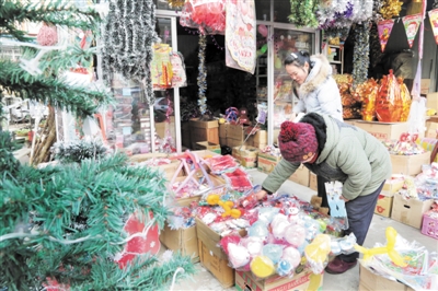 12月7日,在市中区香港街一家批发商店里,挂满了各式各样闪亮的饰品,高矮不一的圣诞树,前来购买圣诞装饰品的顾客络绎不绝。 (记者 王震 摄)