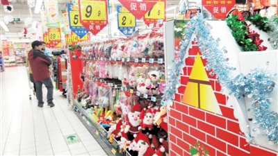 12日,市中区振兴路上一家超市内摆放着有五彩斑斓的圣诞树,还有红彤彤的蛇果和苹果,更有背着礼物包的圣诞老人和圣诞小鹿。虽然还有不到两周的时间圣诞节就到了,但是消费者对圣诞用品的购买热情并没有想象中那么高。不少消费者坦言,除了学生和少部分年轻人以外,多数人对此并不感冒。 (记者 寇光 摄)