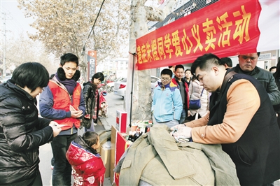 枣庄市第十五中学学生朱煜不幸患病,急需大笔医治费用。12月13日,市义工联盟、市网销协会等部门联合在市中区中兴路为朱煜筹款,一上午的时间就收到善款5890多元。 (记者 孙明春 摄)
