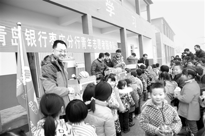 晚报讯 (记者 苏羽 通讯员 刘希伟 王琛 摄影报道)近日,青岛银行枣庄分行青年志愿者服务队来到位于革命老区的山亭区凫城镇崔庄小学,开展了“传递新年快乐,传递爱与梦想”活动,为革命老区的贫困留守儿童送去新年礼物。