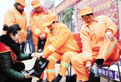 昨日,滕州市一家爱心企业为当地千余名环卫工人每人送上一双雨靴。目前,滕州市在各大企事业单位、交通枢纽、沿街商家设置了不少环卫工人歇脚点,还不定时向环卫工人赠送爱心礼物,表达社会对他们的关爱。