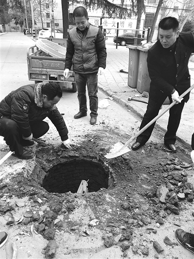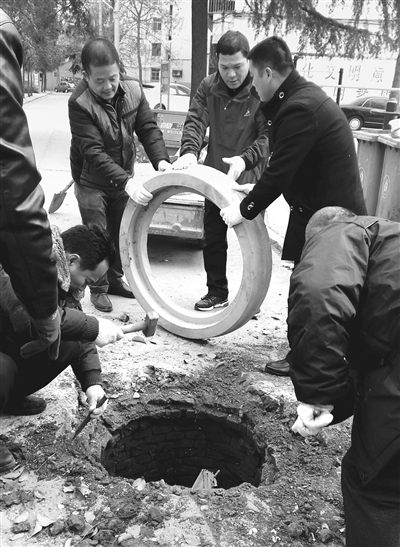 晚报讯 (记者 孔浩 摄影报道) 近日,市中区立新小区内路面上的一个窨井盖,被过往车辆轧坏,有好心人将树枝插在井口处,提醒居民注意安全。记者将这件事告知了小区网格员王昀后,她及时向居委会作了汇报。2015年12月28日上午,几位居委会工作人员对损坏的窨井盖进行了更换维修,居民们对工作人员的快速反应表示满意。