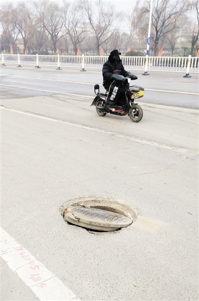 晚报讯 (记者 刘豹 王萍 实习生 张一鸣 文/图)4日,市民宋女士拨打本报热线电话反映,市中区光明东路与东外环交叉路口有两处窨井盖被轧坏,她骑车时不小心骑到窨井里,连人带车摔倒在路边。