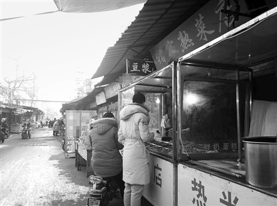 持续的低温天气导致我市多处地区道路结冰,部分小区供水管道冻裂,没有自来水做饭。记者了解到朝阳花园小区的供水已经停了多日,没有自来水做饭的居民纷纷到楼下的热菜摊位购买现成的热菜。 (记者 刘一单 摄)