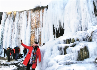 昨日,游客在冰瀑前拍照留念。由于受近期强冷空气影响,山亭区北庄镇龙床河景区现冰瀑奇观,洁白的的冰瀑挂在高高的坝体上像一条条银练,蔚为壮观,吸引了不少游客前来游览。