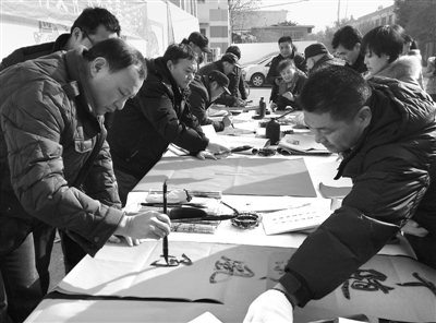 27日,市中区书协东湖画院的12位书画家冒着严寒挥毫送“福”受到村民的欢迎。“今年的春联不用花钱了,这还是头一次。”现场一位中年妇女乐呵呵地等待书画家写好的春联晾干,“春联一写,年味也浓了。” (记者 张莉萍 摄)