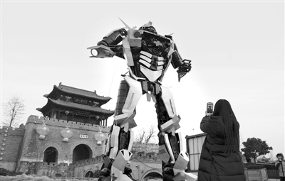 日前,台儿庄古城西门口立了一个高达数米的变形金刚,吸引了广大游客,特别是小朋友前来围观、拍照。