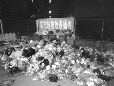 1月29日晚,记者在市中区机厂西岭小区门口看到,正对着小区大门的五个垃圾桶已满,周围的垃圾堆积成山。小区一位居民说:“平时这几个垃圾桶周围就总堆着垃圾,负责清扫垃圾的人清扫不及时。遇到这样的冷天,更没人来清理了。”灯光下,这“壮观”的垃圾山让路过的居民皱眉叹气。(记者 杨晓斐 摄)