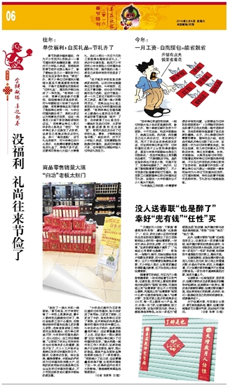 “‘天增岁月人任性’,下联是‘春满乾坤兜有钱’,横批是‘也是醉了’。” 近日,家住立新小区的市民黄先生在他的朋友圈晒出了自己在购物网站上选中的一副创意春联。一时间引来众多好友点赞,不少好友回复,“这样的春联真是太搞笑了”、“也能这么写春联也是醉了”……前些年,一些银行、超市、加油站都会向客户免费发放春联,而今年这种情况非常少,让不少市民需要自掏腰包买春联,不少年轻人表示,以前商家赠送的春联毫无新意,还不如在网上购买创意春联。