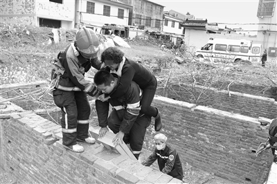 4月5日13时13分,在薛城区交警大队附近,一妇女不慎落入一在建工地的地基中摔伤,路人见状忙拨打消防电话求救。救援人员赶到后对该妇女进行了简单的包扎和固定,由一消防官兵将妇女背出,并送往医院进行治疗。 (记者 王晨曦 摄)