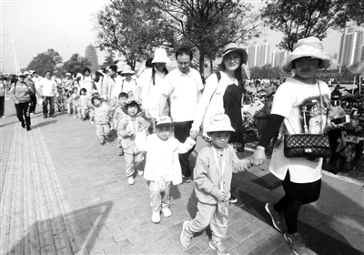 4月22日是世界地球日,不少家长带着孩子,围绕滕州市荆河两岸徒步行走,呼吁人们环保出行。 (特约记者 侯志龙 摄)