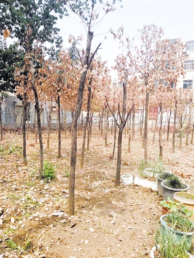 据文化三村的沈先生介绍,这个院子里种植的香樟树有近百棵。往年这个时候,沈先生和其他邻居经过这里时,都能感觉到春的气息,可是去年冬天的一场降雪过后,院子里的香樟树开始出现发蔫的现象。“照目前的情况来看,院子里的树有三分之二的树叶全部枯萎,受损相当严重。”沈先生说。